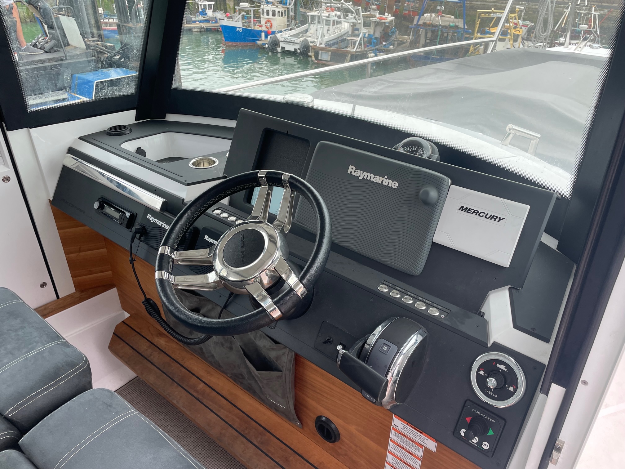 Axopar 28 Cabin for sale. Very well maintained example of the cabin version of these very popular boats. Commissioned in 2017 and powered by a Mercury Verado 300hp 4-stroke outboard with electronic throttle. Documented service history - last serviced October 2025 and showing only 360hrs from new. This high spec example comes with fly-by-wire controls, hydraulic trim tabs, bow thruster, upgraded Raymarine radar/plotter/AIS system, Raymarine depth rereader, Raymarine DSC VHF radio, Sony audio system and exterior search light. The comfortable wheelhouse is trimmed in grey upholstery with contrasting teak panelling and will covert to a small double berth and with the twin berth aft cabin and seawater heads, these boats are very popular weekenders. For more infortmation or to arrange a viewing call 023 9283 3166 or email.