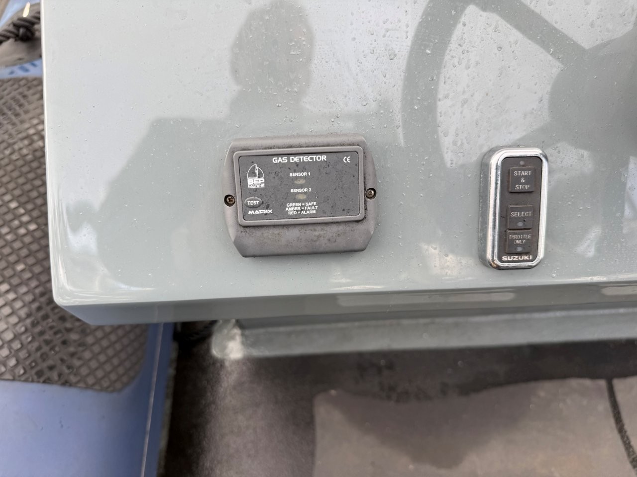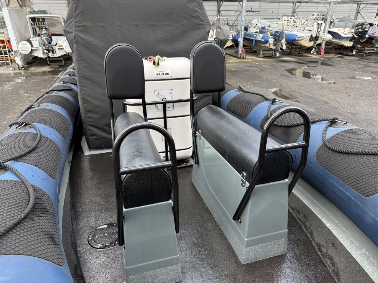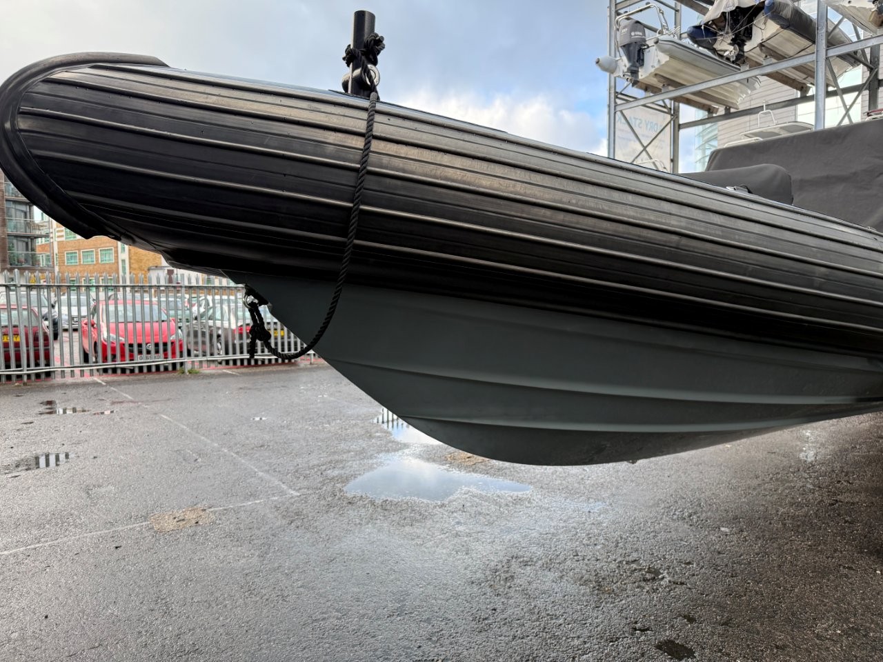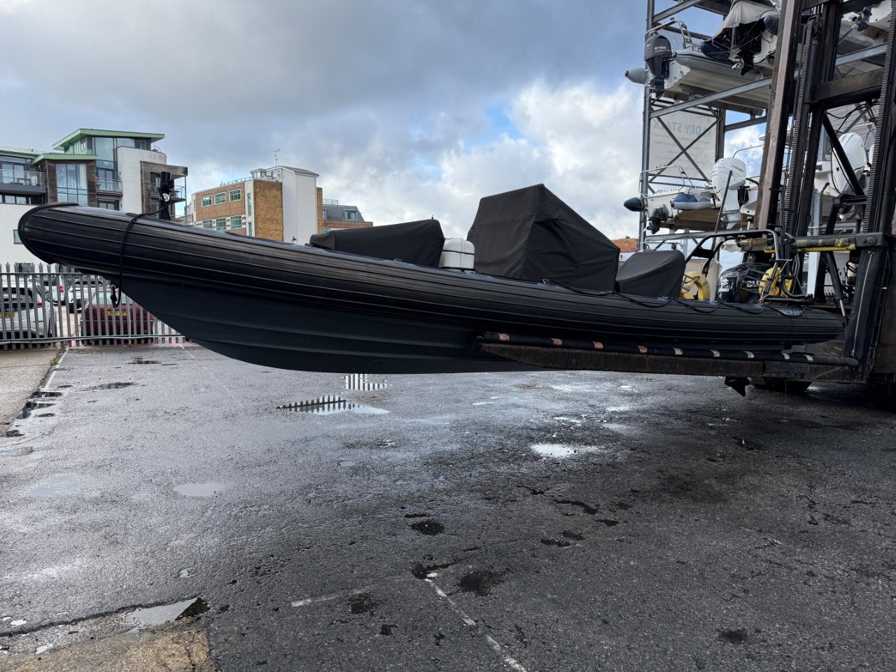 Ribcraft 9m rib for sale. A rare opportunity to acquire a commercial specification dive support/commercial marine support rib from this highly regarded manufacturer of heavy-duty all-weather boats. Built for an international dive equipment supplier in 2018 it comes highly equipped and with very little use. Powered by a Suzuki 250hp four stroke with only 200 hours use and a full service history. It comes fitted with electronic throttle, push button start, hydraulic steering and automatic bilge pump. Seating comprises two long double jockey seats in the bow with a custom-made liferaft cage behind, wing-backed helm and navigator seats and a further two twin jockey seats to the rear with a bottle rack behind. The commercial grade “A” frame is fitted with a hinged diver recovery ladder, dive flag post, navigation lights and spot lamps. The extra wide console gives extra foul-weather protection and is fitted with Icom M333 VHF, Raymarine Hybridtouch Axiom plotter/sounder with engine management combo screens, gas detector and deck compass. Extras include console and seat covers and an all-over winter cover. The boat is not currently coded but would require little to get certificated. This a rare opportunity to purchase a relatively little used commercial rib at a substantial saving on the new price. Vat is included and a Vat invoice will be provided. Please note that there is no trailer with this boat. For further information or to arrange a viewing here at KB Drystack in Old Portsmouth, call 023 9283 3166 or email.