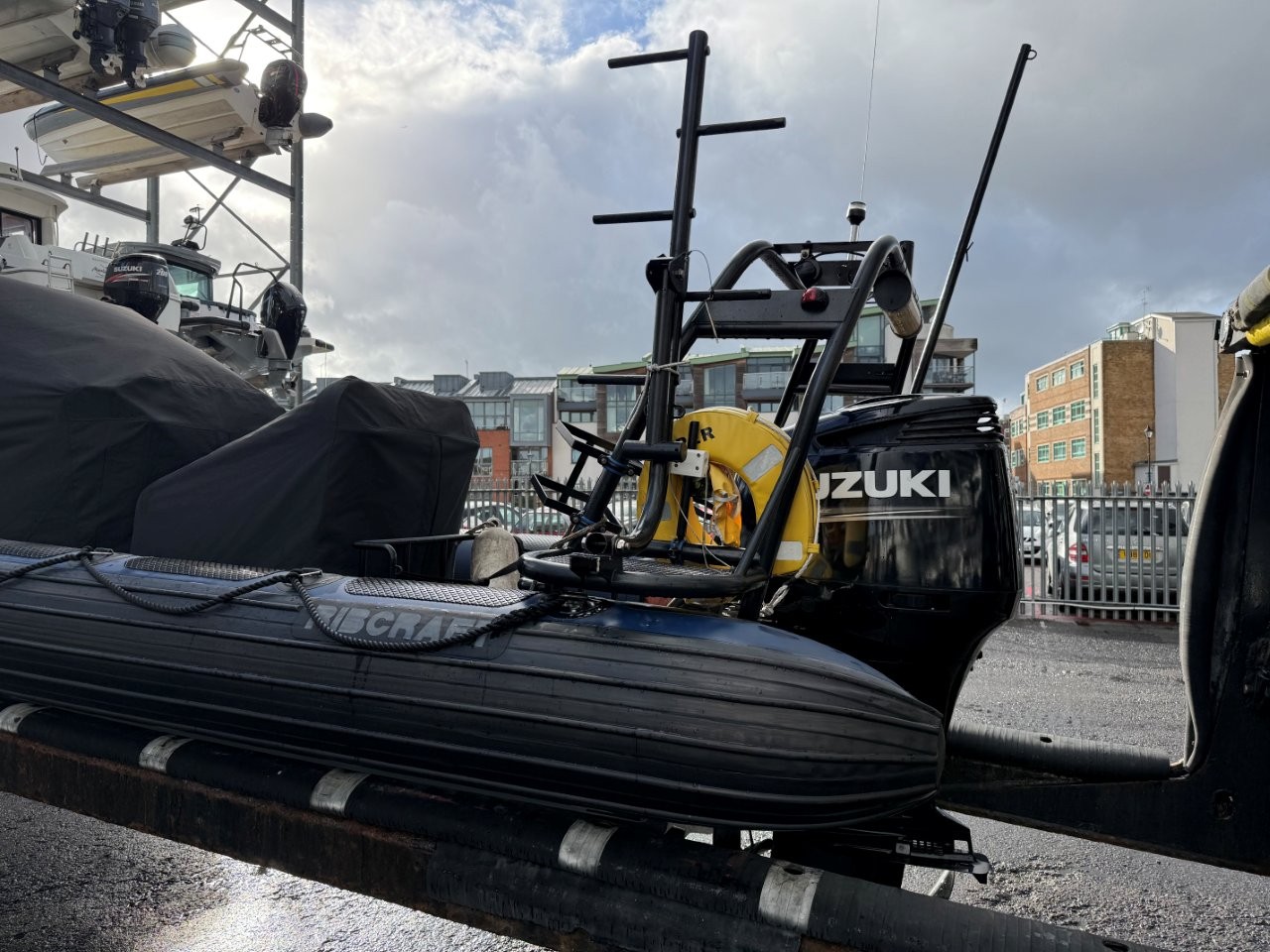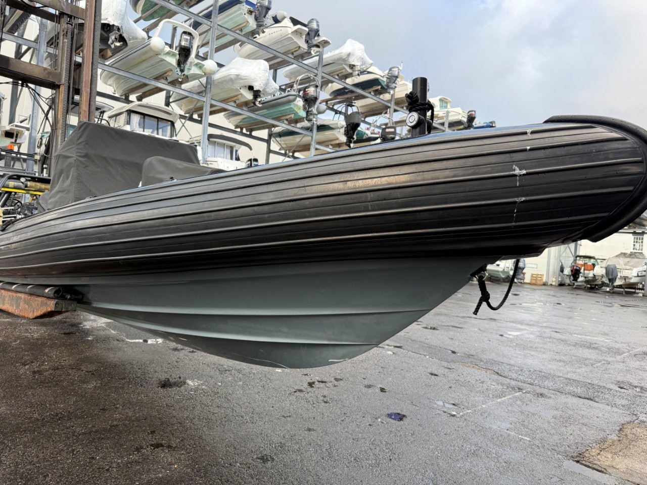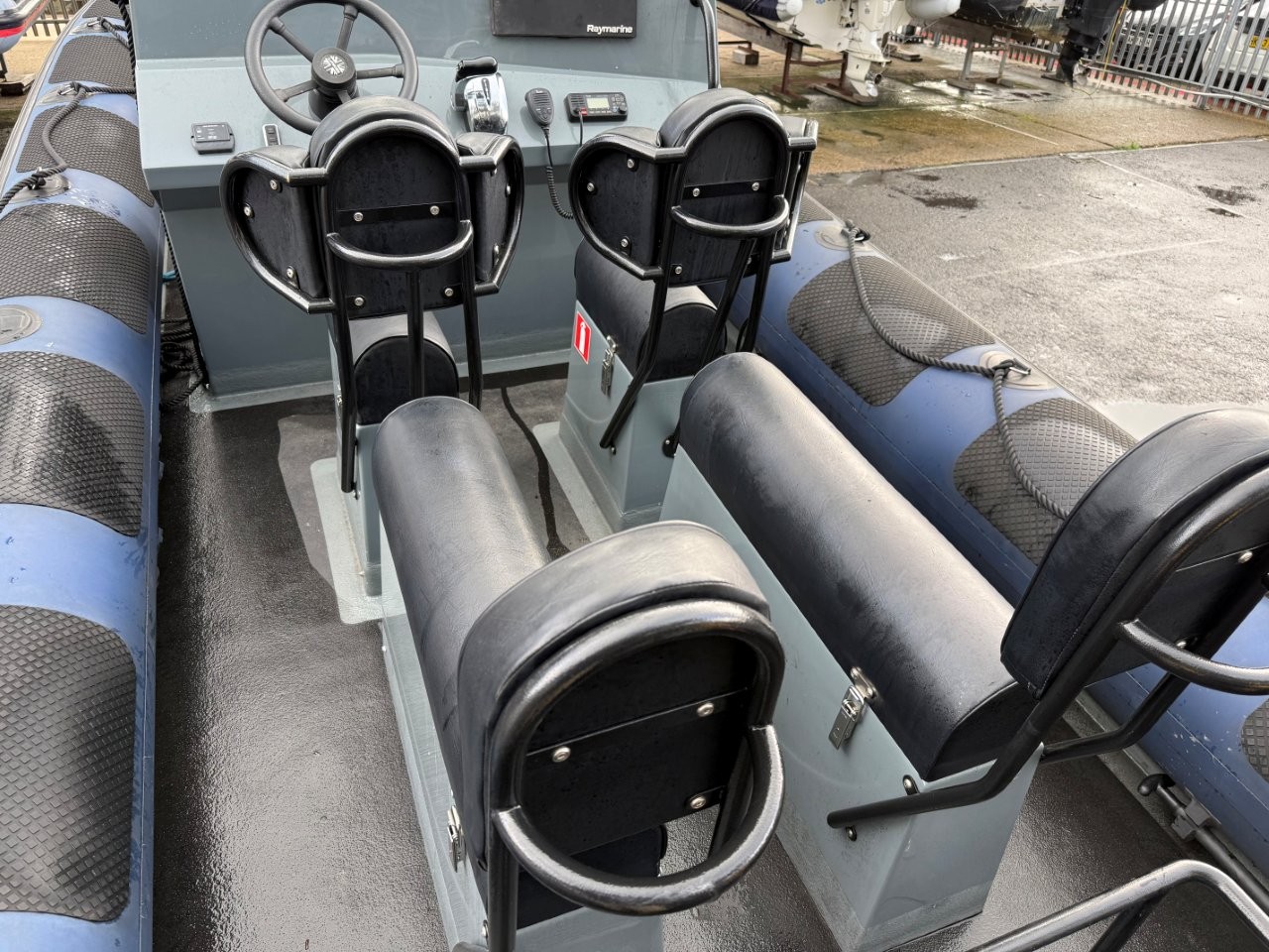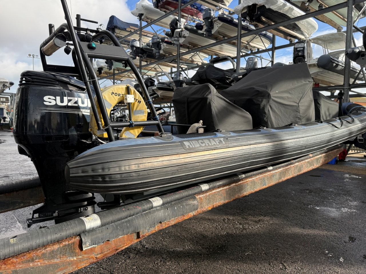 Ribcraft 9m rib for sale. A rare opportunity to acquire a commercial specification dive support/commercial marine support rib from this highly regarded manufacturer of heavy-duty all-weather boats. Built for an international dive equipment supplier in 2018 it comes highly equipped and with very little use. Powered by a Suzuki 250hp four stroke with only 200 hours use and a full service history. It comes fitted with electronic throttle, push button start, hydraulic steering and automatic bilge pump. Seating comprises two long double jockey seats in the bow with a custom-made liferaft cage behind, wing-backed helm and navigator seats and a further two twin jockey seats to the rear with a bottle rack behind. The commercial grade “A” frame is fitted with a hinged diver recovery ladder, dive flag post, navigation lights and spot lamps. The extra wide console gives extra foul-weather protection and is fitted with Icom M333 VHF, Raymarine Hybridtouch Axiom plotter/sounder with engine management combo screens, gas detector and deck compass. Extras include console and seat covers and an all-over winter cover. The boat is not currently coded but would require little to get certificated. This a rare opportunity to purchase a relatively little used commercial rib at a substantial saving on the new price. Vat is included and a Vat invoice will be provided. Please note that there is no trailer with this boat. For further information or to arrange a viewing here at KB Drystack in Old Portsmouth, call 023 9283 3166 or email.